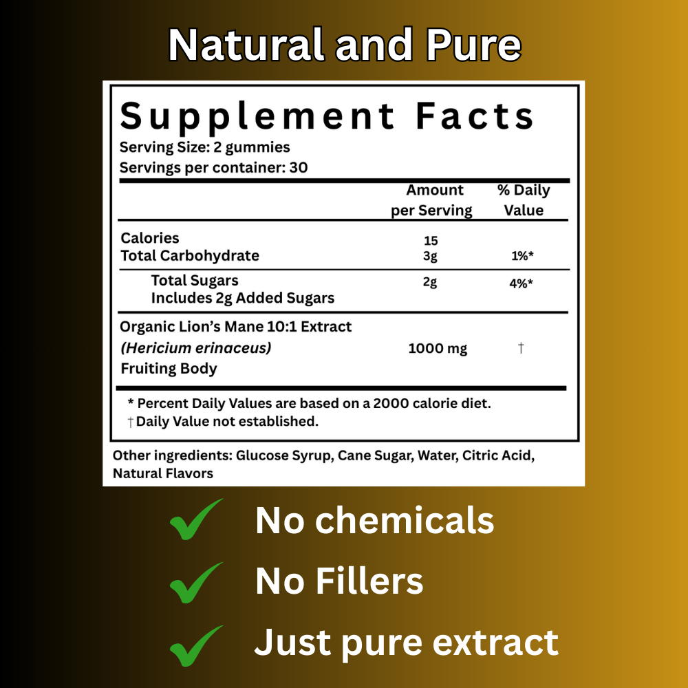 Unlock Your Mental Clarity with Our Potent Lion's Mane Gummies. Double-extracted for maximum potency, our Lion's Mane gummies are your daily ally for enhanced focus and cognitive function. Lion's Mane naturally contains beta glucans and triterpenes, nourishing your brainpower. For optimal results, take 1-3 gummies, 1-3 times daily. Each bottle provides 30 servings to support your mental sharpness throughout the day. Start with one serving in the morning, and feel free to take up to three servings daily to fuel your cognitive edge.